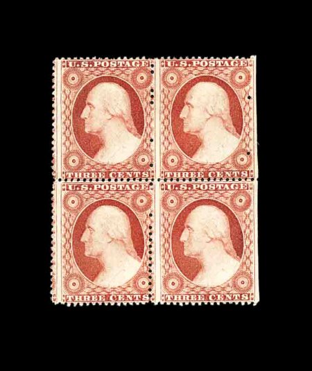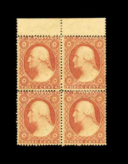 73 ogbl 26a image#26a, 3c Dull red, Ty. IIa, top sheet-margin mint block of four, this type is distinguished from the more common Type II by having the side frame lines broken between each design rather than being continuous, vertical multiples are especially useful in showing this type (top and bottom margin examples of normal Type II are frequently mistaken for Type IIa), only two plates were used for these and Carroll Chase considers them to be actually scarcer than the perforated Type I stamps despite the drastically lesser catalog value assigned to this type, o.g., h.r., fine and an exceptionally elusive block. (Image) 1,900.00