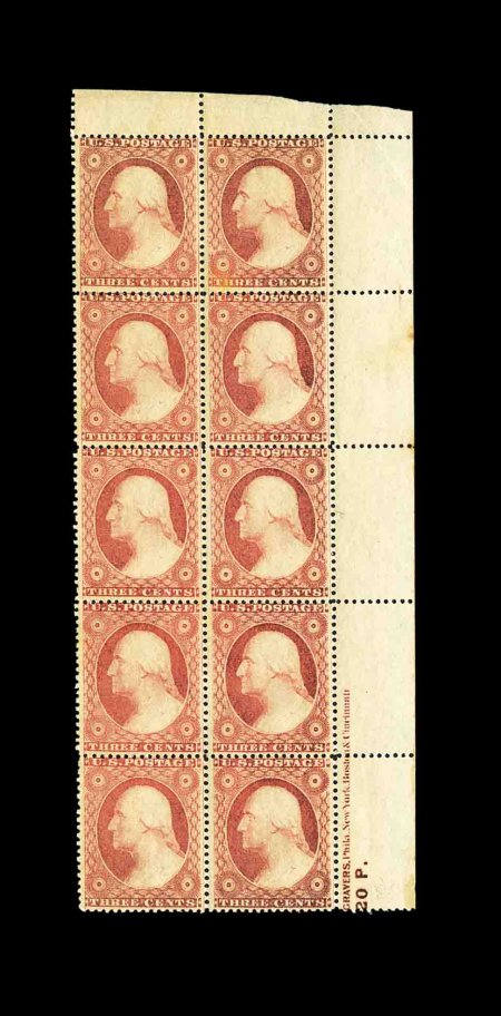 71 ogbl 26 #26, 3c Dull red, Ty. II, top right corner partial imprint block of ten, with plate no. "20P.", rich color, o.g., top right stamp has a small tone speck and top pair is hinged, bottom block of eight is never hinged, quite well centered for this ranging from fine to very fine. (Image) 960.00+
