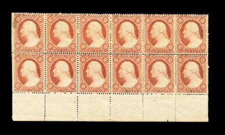 72 ogbl 26 image#26, 3c Dull red, Ty. II, bottom sheet-margin block of twelve with center line at left, quite well centered for this, o.g., h.r. reinforcing some perforations, but three of the best centered stamps are n.h., small faults to the left straight edge pair, otherwise fine-very fine. (Image) 1,200.00+