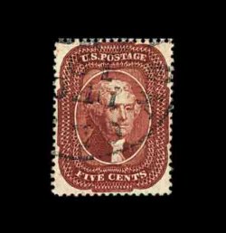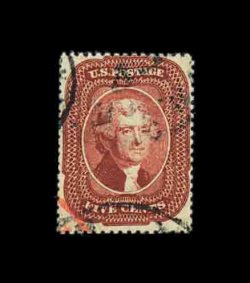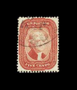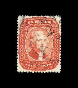 76 O 27 image#27, 5c Brick red, Ty. I, an absolutely gorgeous used example, being in a quality which places it among the finest available, possessing essentially perfect centering amid uncharacteristically large margins, so large in fact that no portion of the design is impinged by perforations, gloriously rich color and perhaps the strongest impression we have ever encountered on a Five Cent Brick red, bright paper as well, fully intact perforations, all wonderfully postmarked with a very light and neat town c.d.s., extremely fine; a lovely used gem for the finest collection; 2002 PF certificate. (Image) 1,400.00