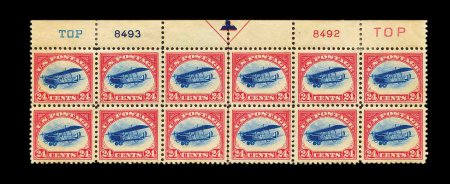 824 ogPB C3 image#C3, 24c Carmine rose and blue, top margin arrow, double "TOP" and plate nos. 8493, 8492 block of twelve, o.g., h.r. in top selvage, nine stamps n.h., light overall aging to paper and faint vertical crease affecting two stamps, very fine appearance. (Image) 1,250.00
