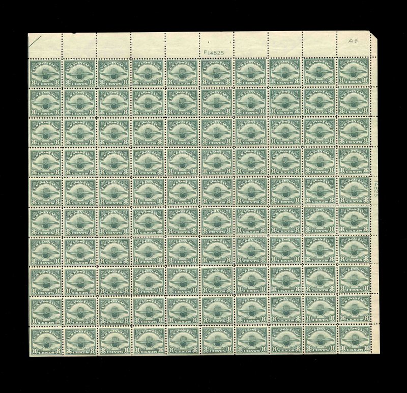 825 nhbl C4 #C4, 8c Dark green, top right plate no. F14825 pane of 100, the vast majority of stamps are very well centered, rich color, o.g., n.h., trivial perf. separations at bottom, very fine-extremely fine. (Image) 4,170.00+