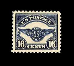 826 nh C5 image#C5, 16c Dark blue, an eye-catching mint left sheet-margin single, being incredibly well centered amid extraordinarily wide margins, plus it possesses prooflike color and impression on immaculate white paper, pristine o.g., n.h., extremely fine; while nice examples of #C5 can be found, very few possess all of the superb qualities that this stamp does; 2002 PSE certificate for a block of four, this being the bottom left stamp. (Image) 145.00