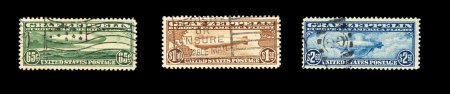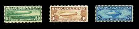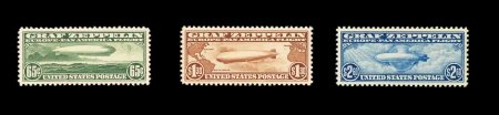 829 nh C13-15 image#C13-15, 65c-$2.60 Graf Zeppelins cplt., an exceptionally choice mint set, each stamp being extraordinarily well centered within large balanced margins, strong rich colors, pristine o.g. without the usual gum bends and skips, n.h., extremely fine; an especially handsome and well matched set; each stamp accompanied by a 1996 or 1997 PF certificate. (Image) 2,160.00