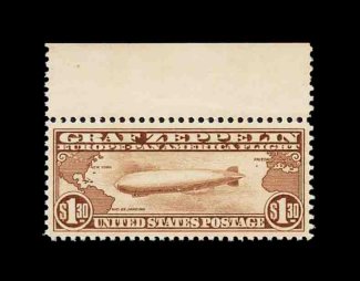 832 nh C14 image#C14, $1.30 Graf Zeppelin, choice top sheet-margin single, exceptionally well centered and margined, strong rich color, pristine o.g., n.h., extremely fine; the $1.30 value is the most difficult in the set to find in this gem mint quality; 2001 PF certificate for a block of four, this being the top right stamp. (Image) 700.00