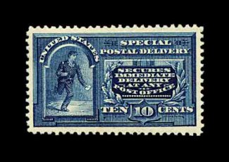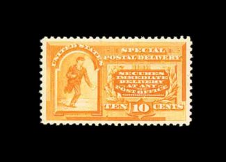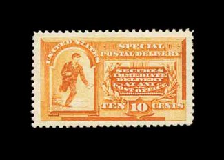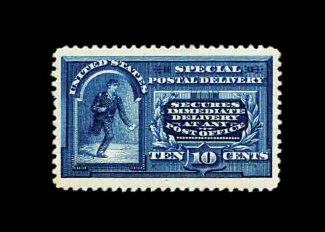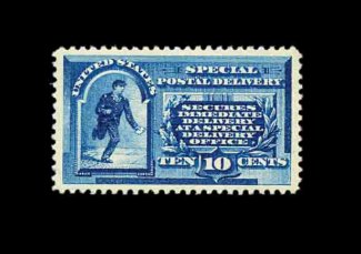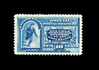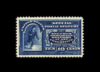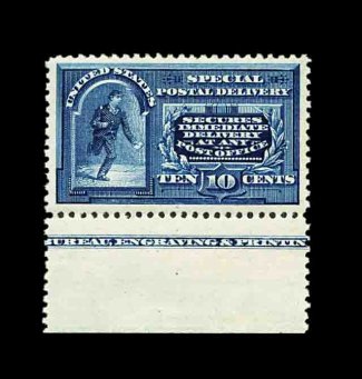 838 og E4 image#E4, 10c Blue, an exceptionally handsome and choice bottom sheet margin imprint single, featuring extravagantly large margins which are seldom associated with this scarce special delivery, wonderfully well centered as well, prooflike color and impression on bright paper, o.g., relatively lightly hinged, extremely fine; 1998 PSE certificate for a strip of three from which this stamp was taken, as well as a 2001 PF certificate for the single; ex-Caballero. (Image) 800.00