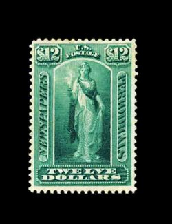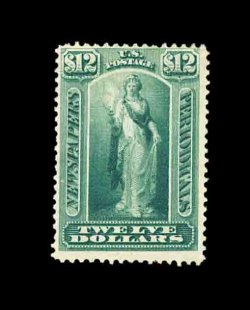 908 og PR28 image#PR28, $12.00 Blue green, excellent centering within large margins, deep intense color and a strong detailed impression, certificate states "disturbed part o.g.", but it is nearly full o.g. and has just had some hinges removed, certificate also mentions two corner creases which are truly insignificant, still an extremely fine and handsome example of this rarely offered newspaper stamp; 2002 PF certificate. (Image) 3,250.00