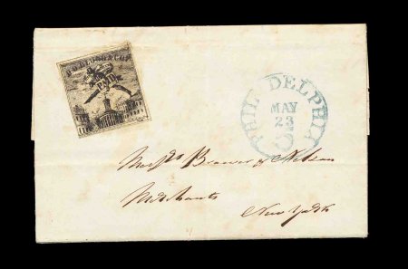 1000 c 15L5 image#15L5, D.O. Blood & Co., Philadelphia, Pa., 2c Black, position 12, well margined stamp on 1846 entire merchant's letter to New York regarding a consignment of almonds, appears uncancelled but faint black cancel of dots in bottom right quadrant, blue "Philadelphia/5/May 23" c.d.s. at right, normal file folds to cover causing small wrinkles in top right corner of stamp, a very fine and scarce usage to a non-Philadelphia address; Gibson handstamp on reverse. (Image) 800.00