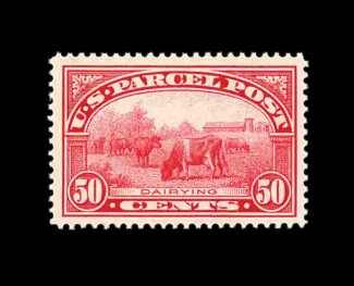 985 nh Q10 image#Q10, 50c Parcel Post, extravagantly large and perfectly balanced margins all around, deep rich color, pristine o.g., n.h., tiny natural inclusion speck in right margin (called a "tiny stain spot" on the current certificate), extremely fine; clear 1996 PSE certificate for a block of four, this being the bottom left stamp, and a 2002 PF certificate for the single. (Image) 550.00