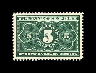 990 nh JQ3 image#JQ3, 5c Parcel Post Postage Due, incredibly well centered within extraordinarily large margins, intensely rich color and a prooflike impression on bright white paper, pristine o.g., n.h., extremely fine; an especially handsome gem; 2002 PF certificate. (Image) 28.50