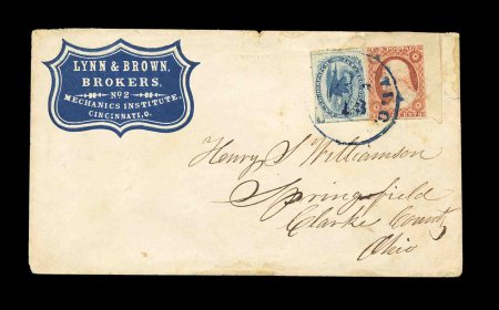 991 c LO2 image#LO2, 1c Blue Eagle carrier, an exceptionally well margined single, all or large portions of dividing lines show on three sides, and the fourth side at bottom is large enough so the dividing line would show on many copies but not this one, along with an impressive top right corner sheet-margin single of 3c Dull red (#11, position 10L3), large enough to show a portion of the center line at right, the other two margins are full and well clear to large as well, both stamps are tied by blue Cincinnati c.d.s. to shield corner card cover of Lynn & Brown, Brokers of that city, posted to Springfield, Ohio, cover has some minor stains with a couple tone spots slightly affecting stamps, and a couple of tiny edge tears to cover, still a very fine cover and impressive in all its aspects. (Image) Est. 400-500