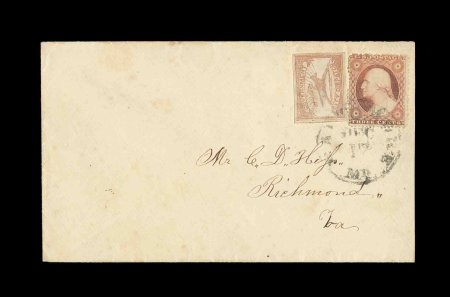 992 c 1LB9 image#1LB9, Baltimore, Md., 1c Red, an unusually well margined and attractive single, neatly tied along with 3c Dull red (#26) by black "Baltimore/Md/Dec 17" c.d.s., cover is particularly clean, very slightly reduced at right, which is of little consequence, very fine and choice. (Image) 300.00