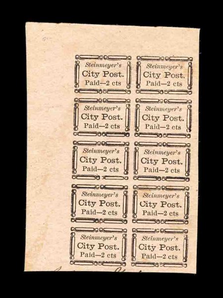 994 ogbl 4LB20 #4LB20, Steinmeyer's City Post, Charleston, S.C., 2c Black on pink, an exceptionally choice and unusually sound sheet of ten, margins are large to huge, showing traces of J.F. Steinmeyer Jr. signature at bottom as he is known to have signed a few sheets, full o.g., lightly hinged in only the top and bottom pairs, lacking the usual faults that are found on most sheets, extremely fine; 1994 PF certificate. (Image) 2,250.00