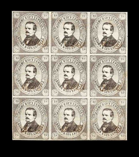 997 ngbl 1L2 #1L2, Adams & Co.'s Express, California, 2c Black, attractive unused block of nine (3x3), clear to large margins all around, ms. initials "ICW" (Isaiah C. Woods), scarcer than the usual initials of Louis Reed, light vertical crease along the left edge affecting the left strip of three, still an extremely fine and scarce multiple. (Image) 750.00+