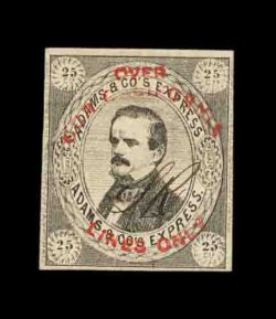 998 ng 1L4 image#1L4, Adams & Co. Express, California, "Over Our California Lines Only" overprint, a scarce and well margined unused stamp showing the minute inscriptions at sides, ms. initials "LR" (Louis Reed), very fine. (Image) 750.00