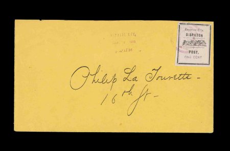 999 c 9L1 image#9L1, Bayonne City Dispatch, Bayonne City, N.J., 1c Black, fresh single with clear to large margins, tied to 1883 pristine yellow cover by violet target, petite three line "Bayonne City/May 12 1883/Dispatch" handstamp at left, exceptionally attractive usage of this scarce later New Jersey local, extremely fine. (Image) 750.00