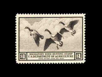 1021 nh RW3 image#RW3, 1936 $1.00 Brown black, excellent centering amid huge margins, fresh color, clean o.g., n.h., extremely fine; an especially large-margined example; 2001 PF certificate. (Image) 325.00