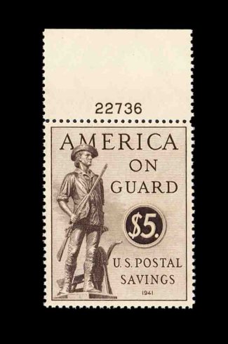 1022 nh PS15 image#PS15, $5.00 Sepia War Savings, top margin plate no. 22736 single, excellent centering within large margins, fresh color, o.g., n.h., an extremely fine gem. (Image) 42.50
