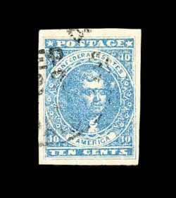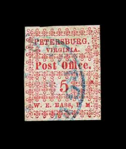1023 O 65X1 image#65X1, Petersburg, Va. 5c Red, position 10, attractive used single, seldom found clear margins all around except just touching the corner ornament at top right, with light portion of blue Petersburg, Va. c.d.s., very fine and scarce; 1997 PF certificate. (Image) 500.00