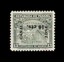 1027 og 36a image#36a, 10c on 13c Gray, "10 cts." inverted, gem mint example of this scarce surcharge error, huge balanced margins all around, full clean o.g., barest trace of hinging, extremely fine; photocopy of 1997 PF certificate for a block of four, this being the top left stamp. (Image) 325.00