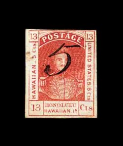 1028 ng 7 image#7, 5c on 13c Dark red, manuscript "5" provisional issue, type II "5" with short flag, unused single, three large margins, closer but just clear at top, bright color, small spot of toning at left, otherwise very fine; a scarce provisional surcharge that was produced to fill a shortage of 5c values until a new printing could be supplied. (Image) 6,750.00