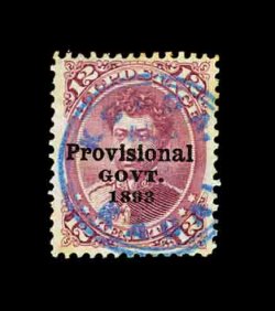 1033 O 69 image#69, 12c Red lilac Provisional Govt. issue, a scarce used example of this key value, centrally struck blue "Koloa, Kauai" double rim c.d.s, very fine and pretty; a particularly difficult stamp to acquire nicely used. (Image) 500.00