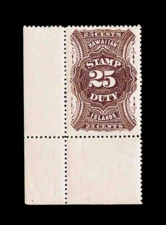1034 nh R10 image#R10, 25c Violet brown, an unbelievably choice bottom left corner-margin copy of the 1894 revenue issue, beautifully centered within large balanced margins, luxurious rich color, o.g., stamp is pristine n.h., extremely fine; scarce in such select high quality. (Image) 750.00