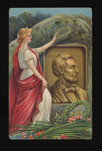 1059 F 367 image#367, 2c Lincoln, single with s.e. at left along the frame line, tied by "Feb 12 1909" first day duplex, town name is indistinct but date is very clear, on the reverse of a lovely Lincoln multicolor postcard, printed in Germany by a multi-color lithographic process that they were famous for, only the slightest edge wear, otherwise a very fine card with first day usage of this commemorative. (Image) 600.00