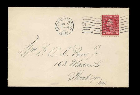 1060 EDU 425e image#425e, 2c Rose red, Ty. I, booklet pane of six, a single from the pane, centered a bit to right, tied to earliest documented usage cover by "Brooklyn, N.Y. Sta. B/Jan 6/1914" machine cancel, choice strike, this locally addressed cover is quite neat as well, very fine; the first day of this stamp is unknown, but it is probably sometime in December of 1913, interestingly the booklet panes were issued prior to the sheet stamps (September 5, 1914), so there is no doubt that this is a booklet pane stamp, and this January 6, 1914 usage is, by far, the earliest documented usage and has withstood the test of time; ex-Fisher. (Image) 450.00