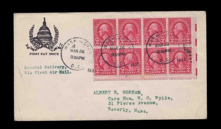 1121 Fbl 634EE image#634EE, 2c Carmine, Experimental Electric Eye, bottom right corner sheet-margin block of eight (4x2), tied to Albert E. Gorham first day cover by "Washington/D.C./Mar.28/ 1935" duplex cancels, Gorham hallmark typed address in green and printed general cachet of the Capitol Dome, very fine; exceptionally scarce with a block and printed cachet. (Image) Est. 750-1,000