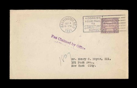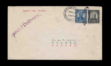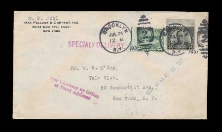 1129 F 697, 699 image#697, 699, 17c Black and 25c Blue green, sheet-margin singles of each tied to a very rare combination first day cover by unofficial "Brooklyn/N.Y./Jul 25/1931" duplex cancels, typed address to W.R. M'Coy, one of the individuals responsible for the few covers that were posted at this post office with either 17c or 25c values, return address of M.G. Johl, sent by special delivery with all the attendant markings and backstamps that go with that service, plus two registry c.d.s. on the reverse that have been marked out with blue crayon, apparently applied in error, slightly reduced at top, very fine; most of the stamps of the last rotary press issue were sent to various post offices at about the same time as they were issued at the Philatelic Agency, but no announcement was made so that collectors could make covers, the Philatelic Agency covers for nearly all the stamps of this issue therefore stand as the earliest documented usages, there are a very few exceptions where stamps could have been used earlier, these Brooklyn usages of the 17c and 25c are a case in point, only through the efforts of several well known philatelists, H.M. Southgate, W.R. M'Coy and probably Max G. Johl, were 26 covers, and maybe a few more by others, posted on this earlier date, the vast majority of these were individual values on cover, which are very rare by virtue of this small number, but even rarer are covers with both values, to our knowledge this is one of two known covers, the other is pictured in First Day Covers of the Regular Postage Issue of 1922-1935 by Jack V. Harvey, and was sold in our September 1996 Unicover Corporation Museum Collection auction for $4,500.00, plus the 10% buyer's premium; an exceptionally rare cover that is indispensible for the specialized collector of these issues; ex-Baron. (Image) 4,000.00