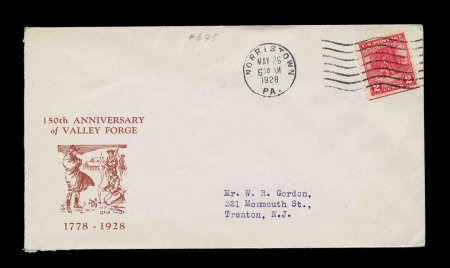 1123 F 645 image#645, 2c Valley Forge, set of seven first day covers from all of the official cities (Cleveland is with Midwestern Exhibition cancel), each with Milton Mauck cachet (Planty #5) at bottom left, Lancaster cover slightly reduced, Valley Forge cover with small tear at top, otherwise a very fine group; a very difficult set to assemble. (Image) 420.00+