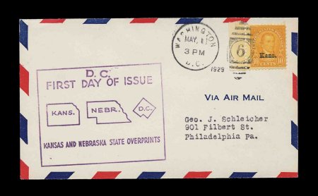 1124 F 658-68 image#658-68, 1c-10c "Kans." ovpts. cplt., each on separate first day cover, all with "Washington, D.C./May 1/1929" cancels, all but two are machine cancels, the other two are duplex handstamp cancels, six of the covers also have a general boxed handstamp cachet in purple, fine-very fine. (Image) 1,110.00