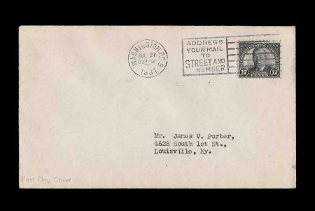 1127 F 697 image#697, 17c Black, fresh single tied to clean first day cover by "Washington, D.C./Jul 27/1931" machine cancel, tiny "First Day Cover" handstamp in bottom left corner, very fine. (Image) 400.00