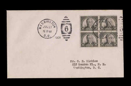 1128 Fbl 697 image#697, 17c Black, well centered block of four, tied to C. E. Nickles first day cover by "Washington/D.C./Jul 27/1931" duplex, with an additional sharp strike at left, extremely fine; high denomination stamps are much scarcer in blocks. (Image) 725.00