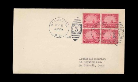 1130 Fbl 698 image#698, 20c Carmine rose, a pretty block of four with radiant color, tied to first day cover serviced by C. E. Nickles by "Washington/D.C./Sep 8/1931" duplex, additional full clear strike at left, very fine. (Image) 650.00