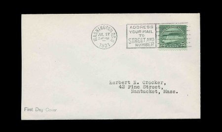 1131 F 699 image#699, 25c Blue green, attractive single, very neatly tied to first day cover by "Washington, D.C./Jul 27/1931" machine cancel, small "First Day Cover" handstamp in bottom left corner, extremely fine. (Image) 400.00