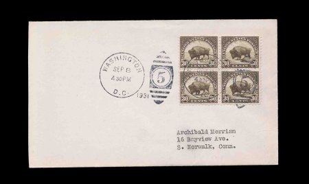 1132 Fbl 700 image#700, 30c Brown, attractive block of four, tied to first day cover by "Washington/D.C./Sep 8/1931 duplex, additional strike at left, serviced by C.E. Nickles with neatly typed address, very fine. (Image) 550.00