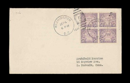 1134 Fbl 701 image#701, 50c Lilac, unusually well centered block of four of this key high value, tied to clean C. E. Nickles first day cover by two strikes of "Washington/D.C./Sep 4/1931" duplexes, extremely fine; a lovely example of this high denomination first day cover that is particularly scarce with a block of four. (Image) 875.00