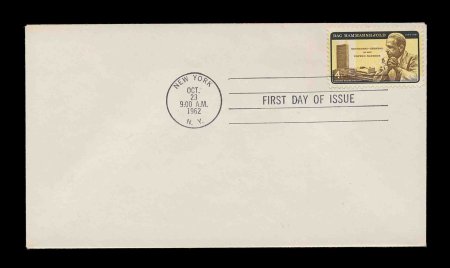 1136 F 1203 var. image#1203 var., 4c Dag Hammarskjold, yellow background inverted, single tied to unaddressed first day cover by "New York/N.Y./Oct. 23 1962/First Day of Issue" postmark, this is the first day of issue for the original issue of this commemorative and not the special printing with inverted yellow, Scott #1204, that was released about a month later on November 16, 1962, the significance of this is that this cover bears an example of the original printing with a true error inverted color, rather than the intentionally printed issuance that so many are familiar with, the stamp is well centered and shows the error well, cover is very fresh and extremely fine; the saga of this error marks the low point in Post Office Department/collector relations, when it became known that an inverted error sheet had been found, the Post Office Department proceeded to purposely print this issue with inverted yellow producing over forty million stamps with the express purpose of destroying the value of the original error, they certainly were successful in doing so on the mint stamps, but the handful of dated first day covers, of which this is one, establishes for a certainty the original error, extremely rare and both under-valued and under-appreciated as this is an inverted error on the par with the small number of other similar inverted errors that have occured in United States stamps over the years, this cover was last offered in the 1995 Rarities of the World Sale of Robert A Siegel Auction Galleries, Inc. where it realized $2,400.00 plus 10% buyer's premium; handstamped on reverse "Genuine First Day Cover/American First Day Cover Soc./ Certificate No. 463" and accompanied by a 1986 PF certificate. (Image) Est. 1,500-2,000