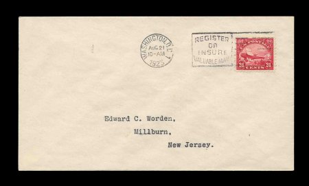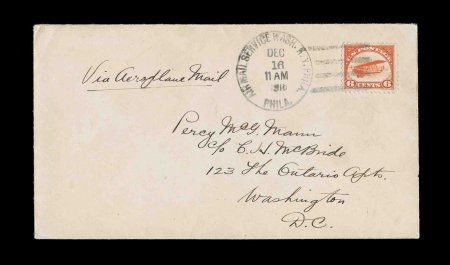 1137 c C1 image#C1, 6c Orange, tied to first flight cover by Dec. 16, 1918 Philadelphia air mail cancel, ms. "Via Aeroplane Mail", quite fresh, choice very fine; a very scarce first flight cover, particularly in this premium quality; ex-Schoendorf. (Image) 2,500.00