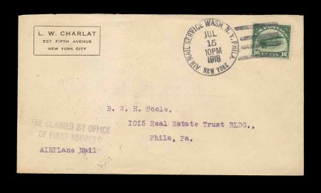 1138 c C2 image#C2, 16c Green, four July 15, 1918 first flight covers, with New York, Philadelphia (two) and Washington, D.C. (purple) "Air Mail Service..." pmks., very fine and scarce group. (Image) 3,200.00