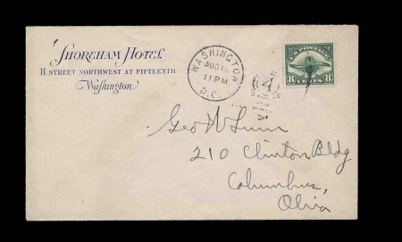 1140 F C4 image#C4, 8c Green, well centered single tied to first day cover by "Washington, D.C./ Aug 15/1923" duplex handstamp, Shoreham Hotel corner card, hand addressed to George Linn, very fine. (Image) 500.00
