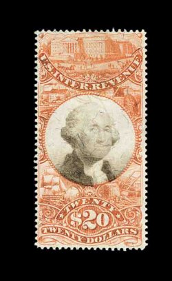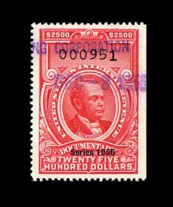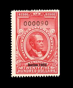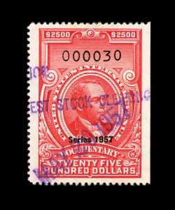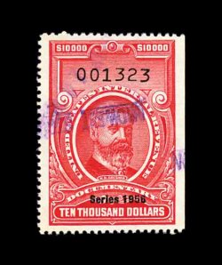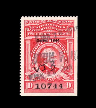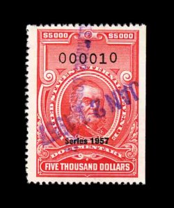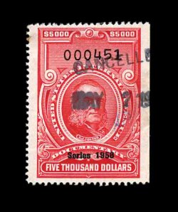 1172 O R722 image#R722, $5,000.00 Carmine, Series 1958, used, with black handstamp and just the faintest trace of perforated cancels, deep rich color, well centered, trivial stained spot at top left, otherwise a very fine example of this scarce revenue; 2002 PF certificate. (Image) 1,100.00
