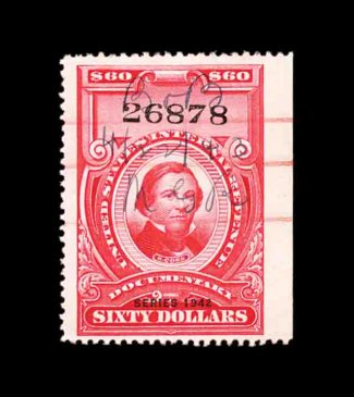 1165 O R357 image#R357, $60.00 Carmine, Series 1942, desirable uncut example, unobtrusive neat ms. cancel and red bars, very fine. (Image) 750.00