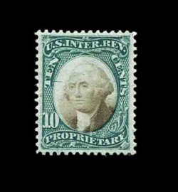 1176 P RB10P2 #RB10P2, $5.00 Green and black, small die proof an impressive and exceptionally rare proof of this large size revenue, measuring 65x108mm, large even margins on all sides, colors are strong and bright, couple of trivial thin specks as would be expected on a proof of this size, and totally insignificant considering the rarity of this die proof, this is the only example that was offered in the famous Morton Dean Joyce sale and may well be unique, extremely fine; ex-Joyce. (Image) 2,000.00