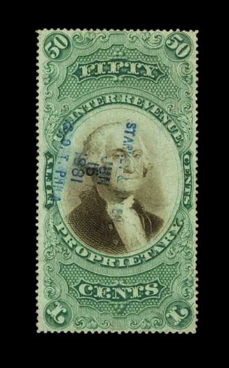 1175 O RB8b image#RB8b, 50c Green and black on green paper, attractive appearing example of this difficult stamp on the scarcer green paper, central blue handstamp cancel, closed tear in bottom right corner and a couple of small thin spots, very fine appearance and much more attractive than usually seen. (Image) 1,000.00