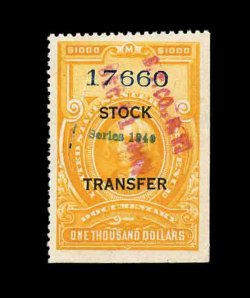 1178 O RD66 image#RD66, $1,000.00 Orange, handstamped "Series 1940" in blue, an attractive appearing used example of this rare high value, possessing rich radiant color on bright paper, well centered and margined, red handstamp and typical cut cancels, faint thin spots in the bottom right margin, otherwise very fine; 2002 PF certificate. (Image) 2,250.00