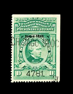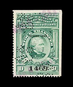 1179 O RD138 image#RD138, $500.00 Bright green, Series 1942, a choice appearing used example of this immense stock transfer stamp rarity, with strong bright color, quite well centered, light violet handstamps as well as the usual perforated initials cancel, typical tiny staple holes at top and a truly insignificant corner crease, still very fine; it is believed that no more than five or six examples exist, making this one of the keys to completing the "dated" stock transfer series; 2002 PF certificate. (Image) 6,500.00
