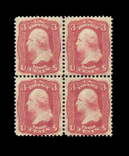 107 ogbl 56 #56, 3c Brown rose "August", an extremely scarce and extraordinarily choice mint block of four, being one of the few premium quality blocks still remaining intact that has not been broken to extract select singles, brilliantly fresh and crisp, prooflike color and impression, about as perfectly centered as this tightly-spaced design allows, pristine o.g., barest trace of hinging, extremely fine; a highly desirable 19th century multiple. (Image) as singles 2,200.00+